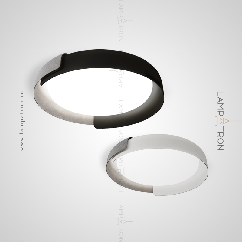 A series of ceiling LED lamps with a round LED panel in a metal case with trim under a gray stone