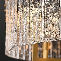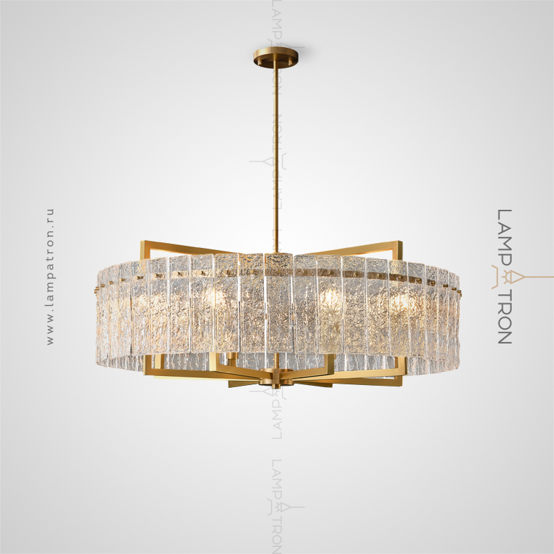 A series of chandeliers on a radial frame with an annular lampshade of rectangular embossed glass plates