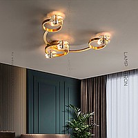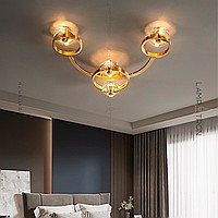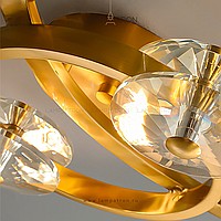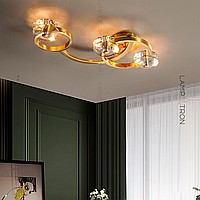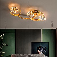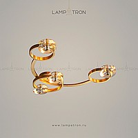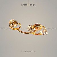 Ceiling lamp in the shape of an arc with round shades in the form of crystals on brass rings