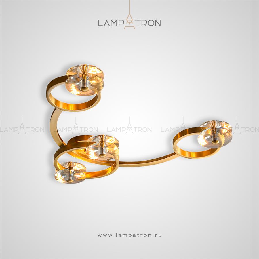 Ceiling lamp in the shape of an arc with round shades in the form of crystals on brass rings
