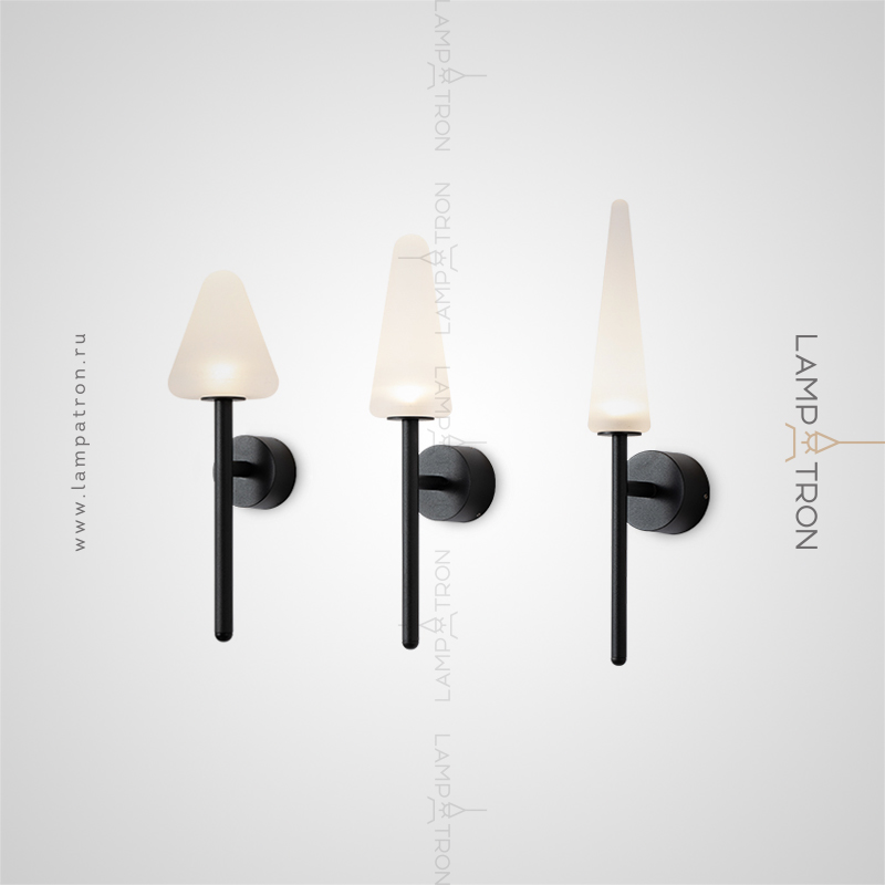 A series of wall -mounted LED lamps with white vehicles of conical shape on black mount