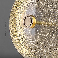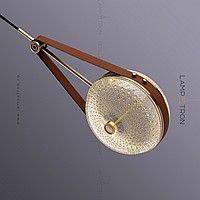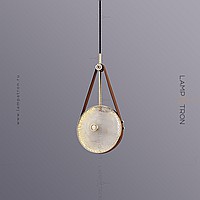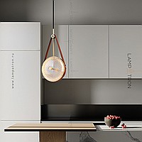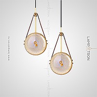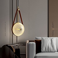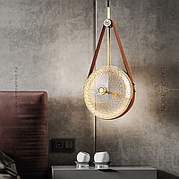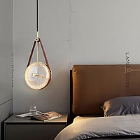 Suspended LED lamp with embossed glass ceiling in the shape of a lens on a leather strap