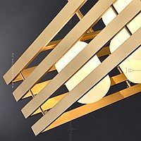 A series of designer chandeliers with matte glass ceilings of elliptic shape inside a rectangular lattice frame