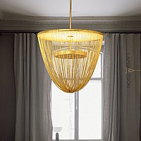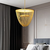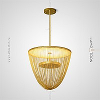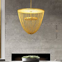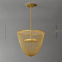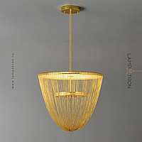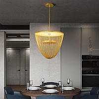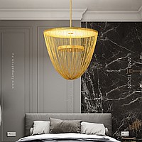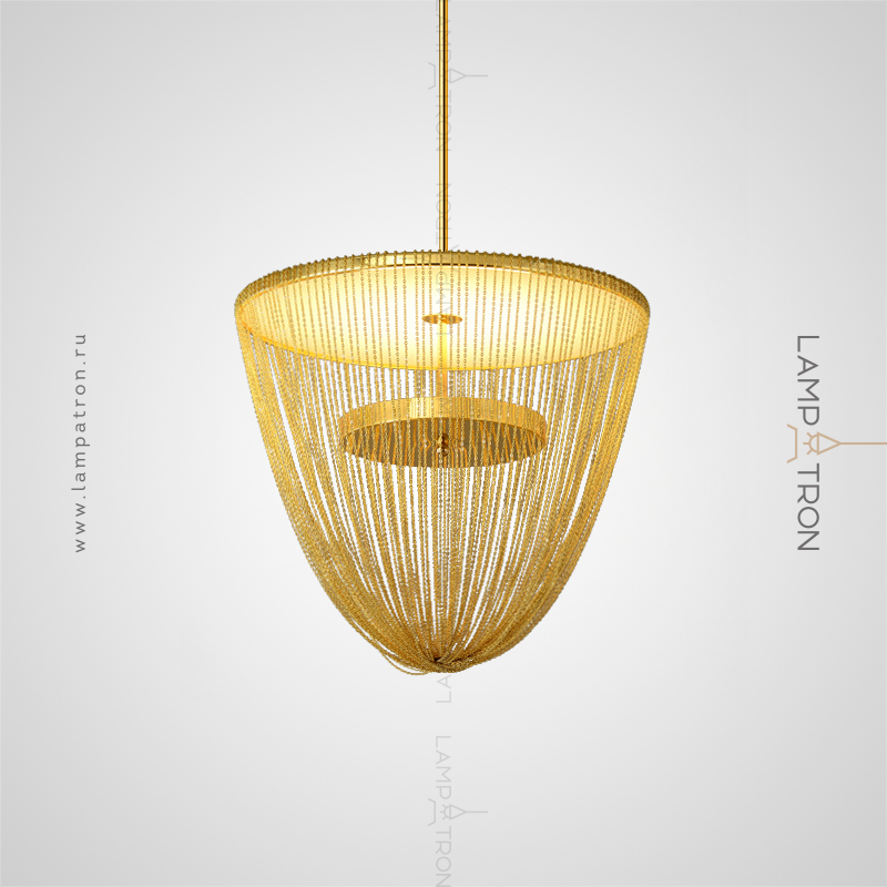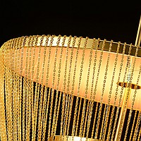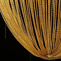 LED chandelier with a disk -shaped ceiling on a vertical rack under a dome lampshade of gold chains