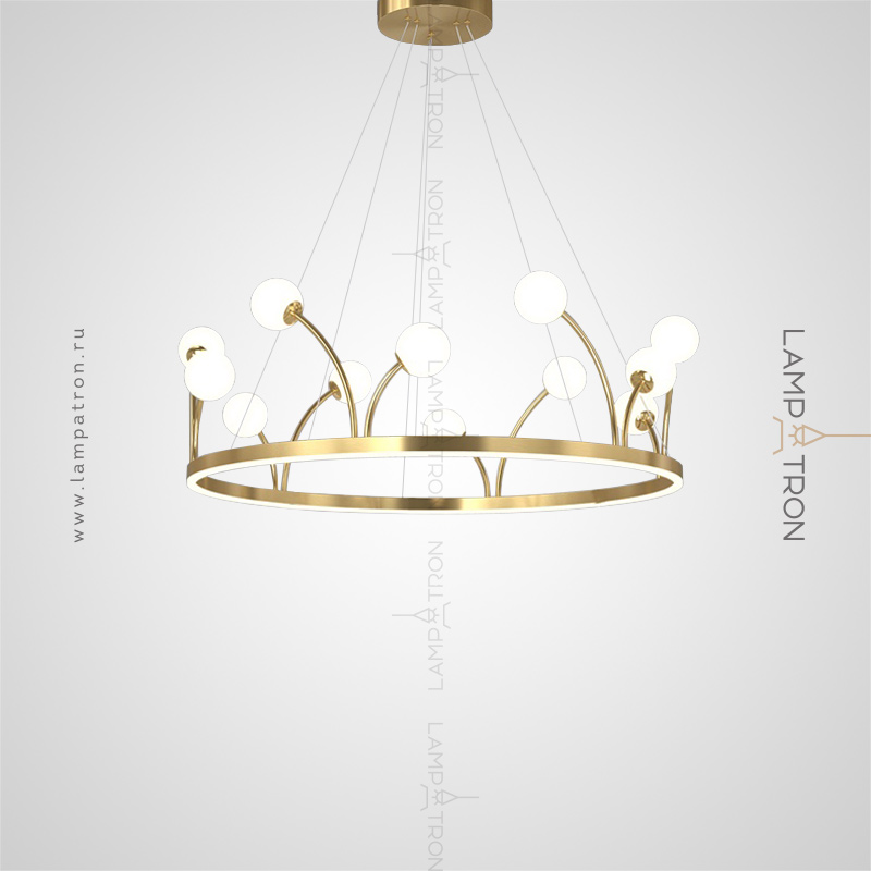 A series of chandeliers with spherical ceilings on arcuate horns and LED-browing on a ring frame