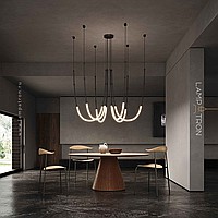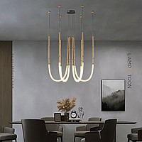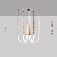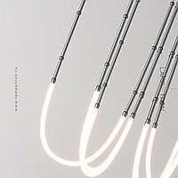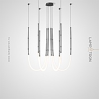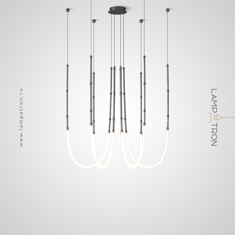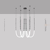 LED spider chandelier with decorative balls on tubular suspensions with C-shaped light elements