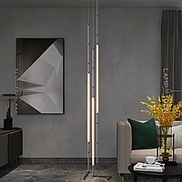 A series of pendant LED lights with decorative balls on a tubular body with vertical light sources
