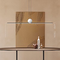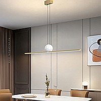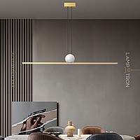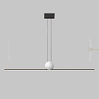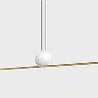 Designer slatted lamp with LED lighting at the bottom of an elongated rectangular body with a ball of white marble