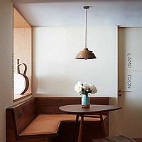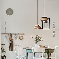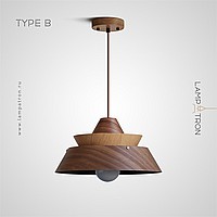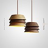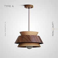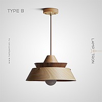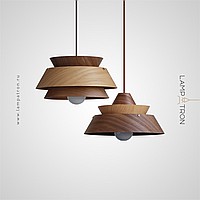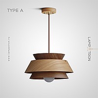 A series of pendant lamps with a geometric lampshade made of dark and light wood