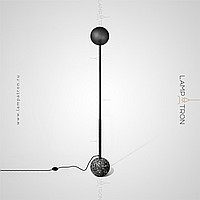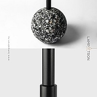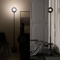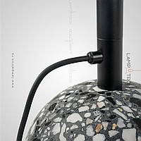 A designer floor lamp with a black matte ceiling and a spherical base of marble Terrazzo