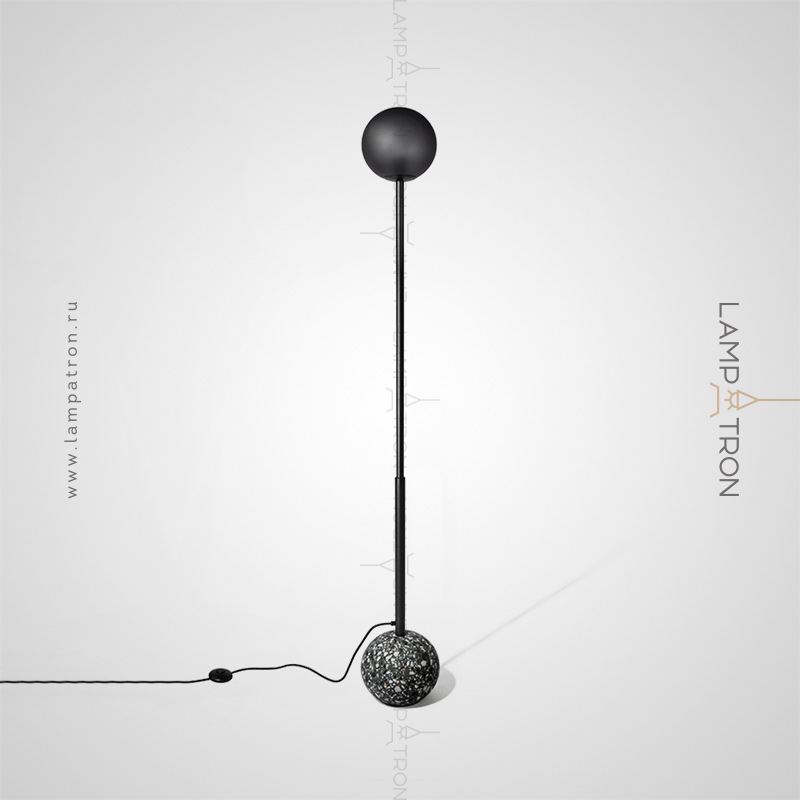 A designer floor lamp with a black matte ceiling and a spherical base of marble Terrazzo