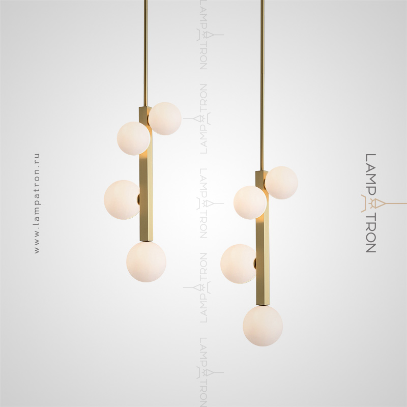 Suspended lamp with spherical glass plafins of different diameters on a rectangular rack