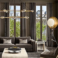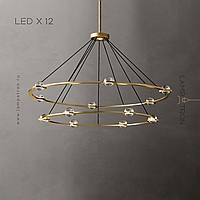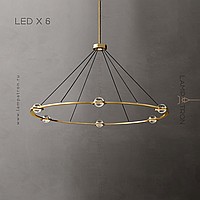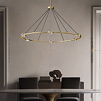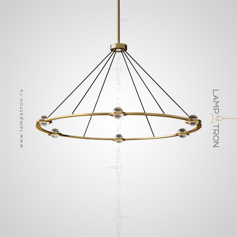 A series of ring LED chandeliers with ceiling spheres in metal hexagons