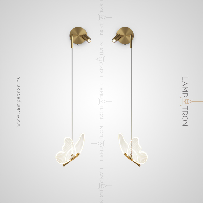 A series of LED symmetrical sconces with pendant shades stylized as butterflies with luminous wings