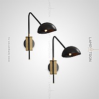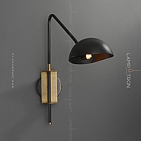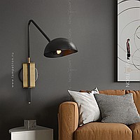 A wall lamp with a metal lampshade of a dome shape on a curved bracket with a combined mount