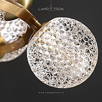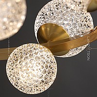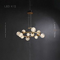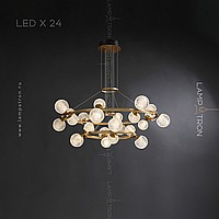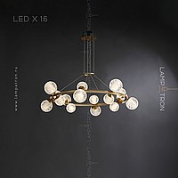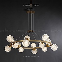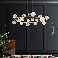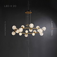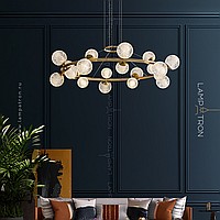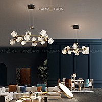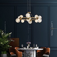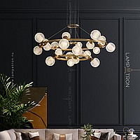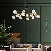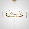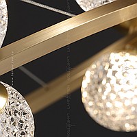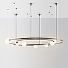 A series of annular LED chandeliers on string suspension with spherical relief ceiling crusts