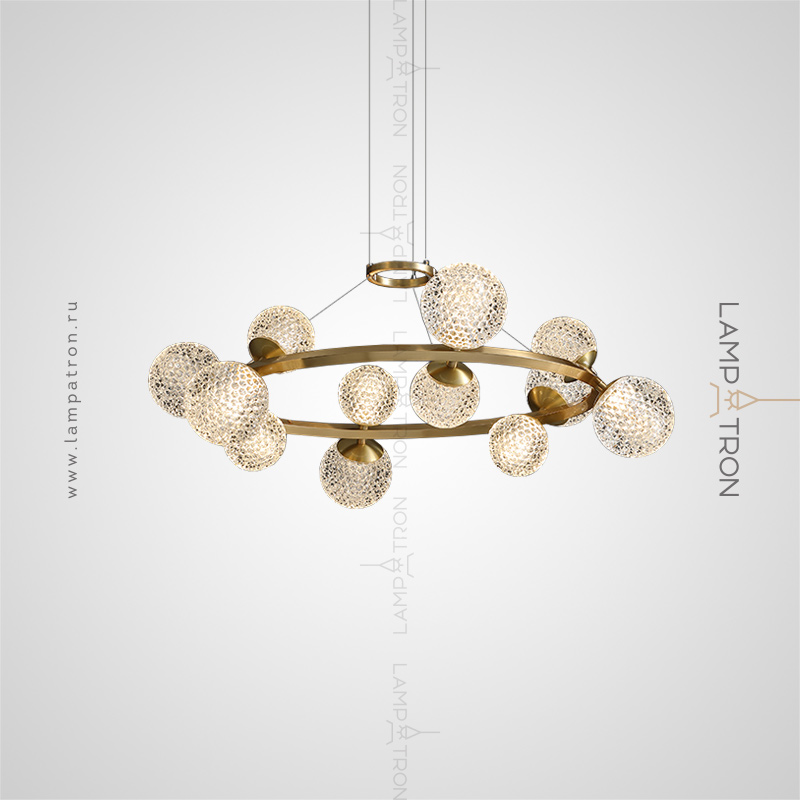 A series of annular LED chandeliers on string suspension with spherical relief ceiling crusts