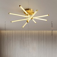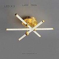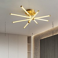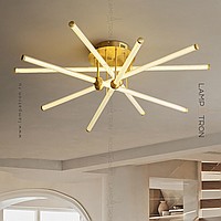 A series of ceiling LED chandeliers with cylindrical white plafins in brass holders