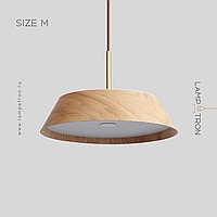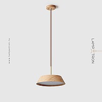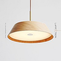 A series of trapezoidal LED pendant lights made of dark and light wood