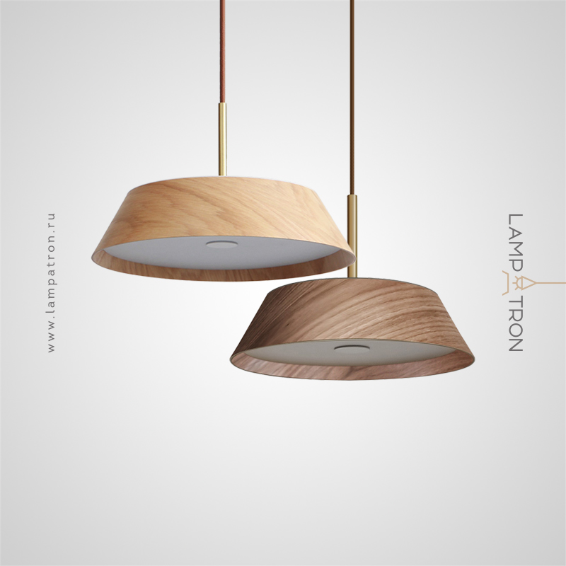 A series of trapezoidal LED pendant lights made of dark and light wood
