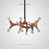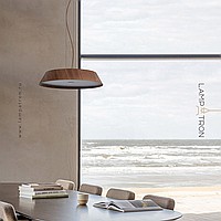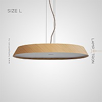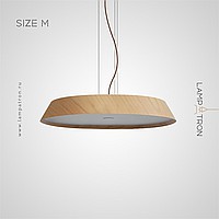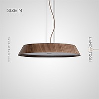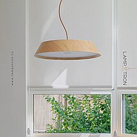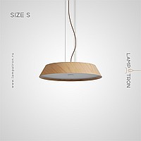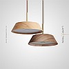 A series of trapezoidal LED pendant lights made of dark and light wood