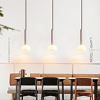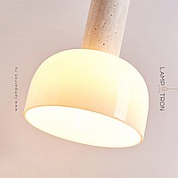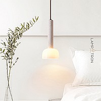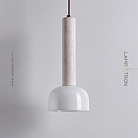 Pendant lamp with a cylindrical body made of travertine stone and a dome-shaped glass lampshade