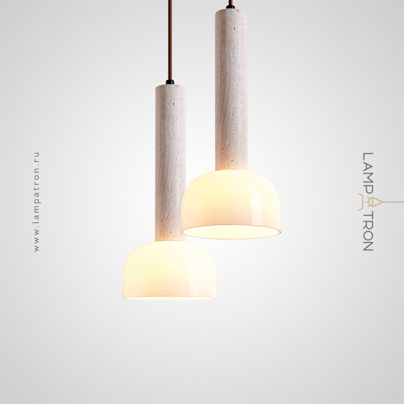 Pendant lamp with a cylindrical body made of travertine stone and a dome-shaped glass lampshade
