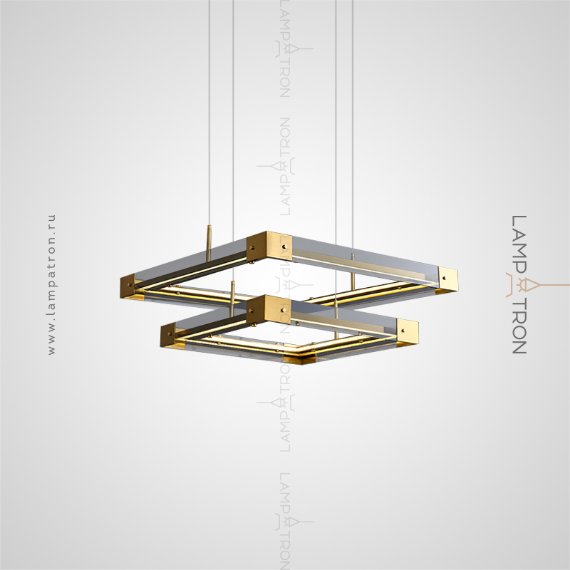 A series of LED chandeliers with a rectangular body of smoky glass with metal corners