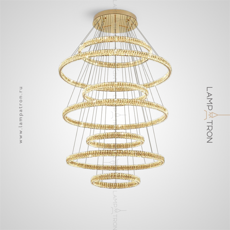 A series of LED chandeliers in the form of a combination of rings of different diameters with multifaceted rectangular crystal diffusers