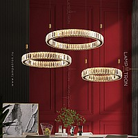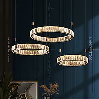 A series of LED chandeliers in the form of a combination of rings of different diameters with transparent diffusers in the form of rectangular crystal plates