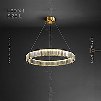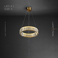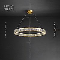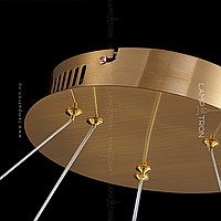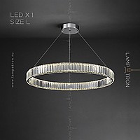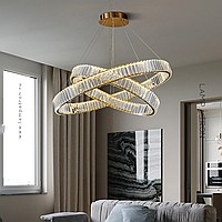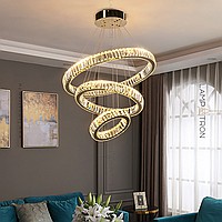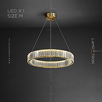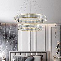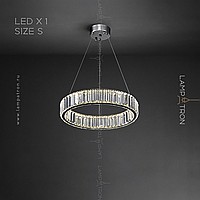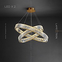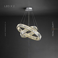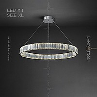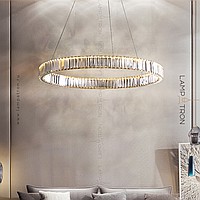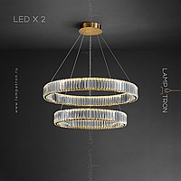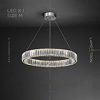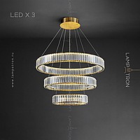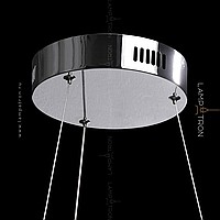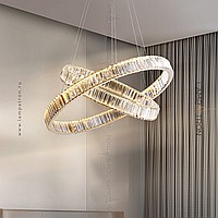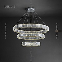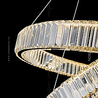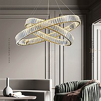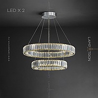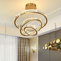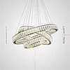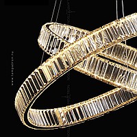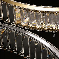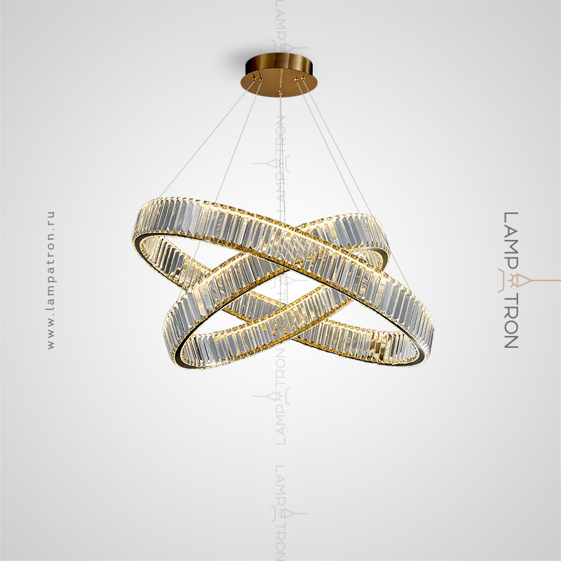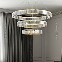 A series of ring LED chandeliers on string suspension with transparent diffusers in the form of rectangular crystal plates
