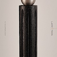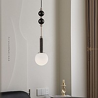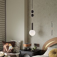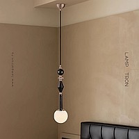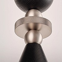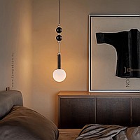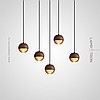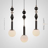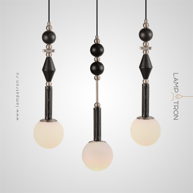 A series of pendant lamps with a spherical shade and wood décor
