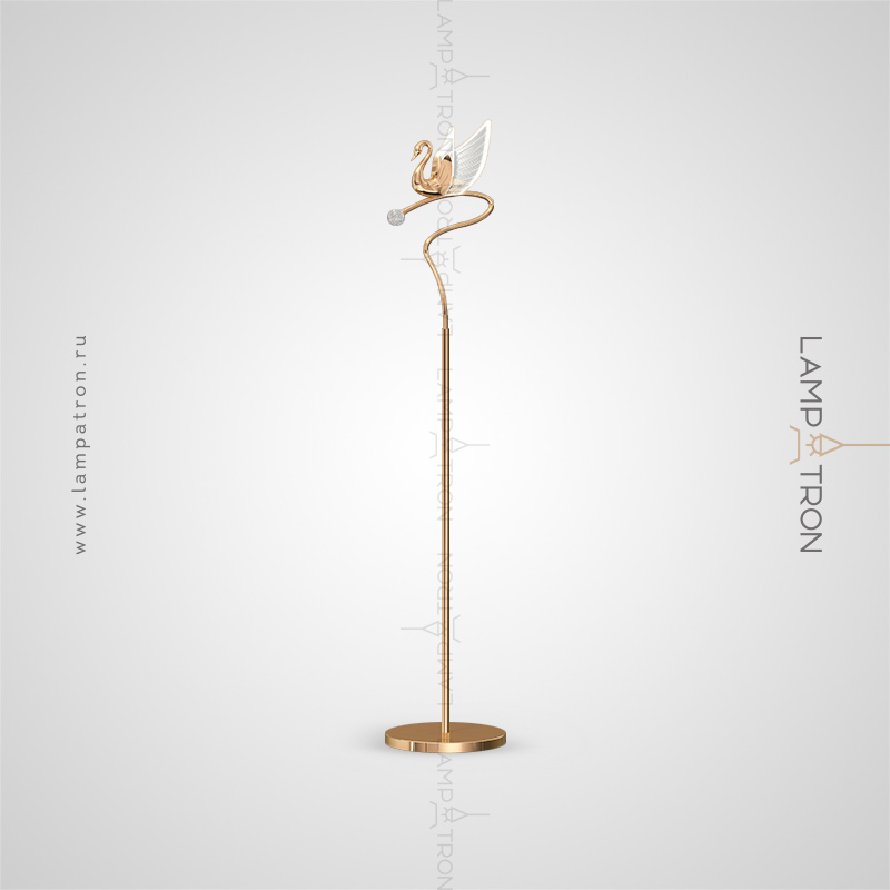 LED floor lamp with a swan form with luminous wings on a curved rack with a shiny ball