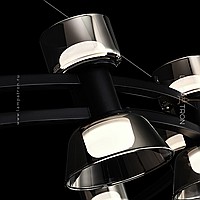 A series of ring LED chandeliers with point sources in hourglass-shaped glass diffusers