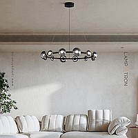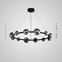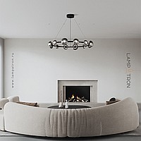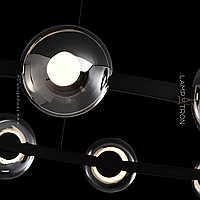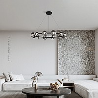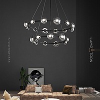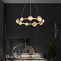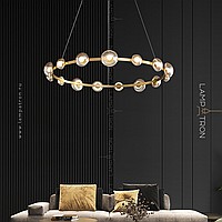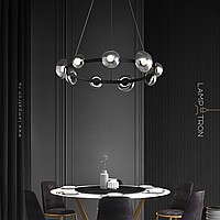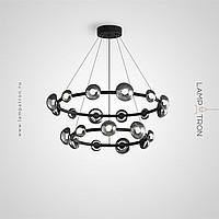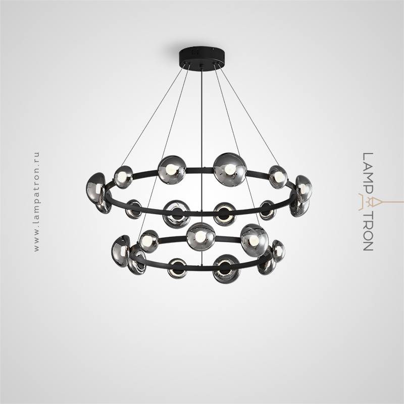 A series of ring LED chandeliers with point sources in amber and smoked glass diffusers