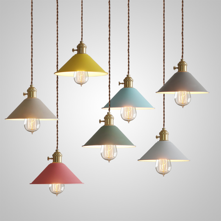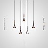 A series of suspended lamps in an industrial style with a metal ceiling on a flexible suspension of a twisted wire in a textile braid.