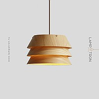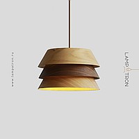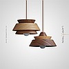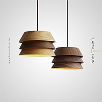 A series of pendant lamps with a three-layer dome-shaped lampshade made of dark and light wood