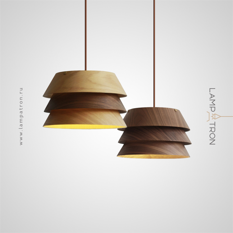 A series of pendant lamps with a three-layer dome-shaped lampshade made of dark and light wood