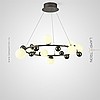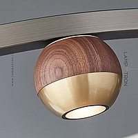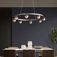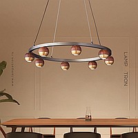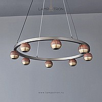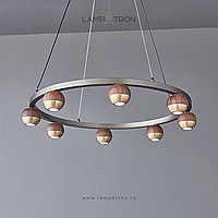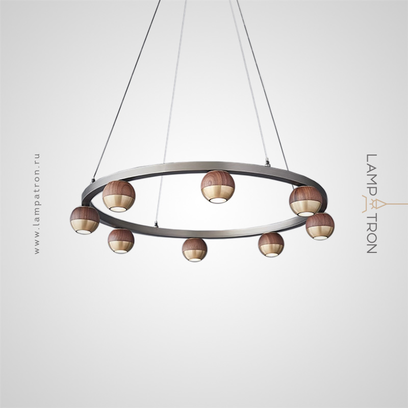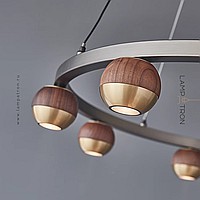 Pendant LED chandelier with spherical shades made of metal and solid wood on a ring frame