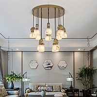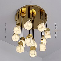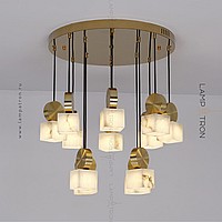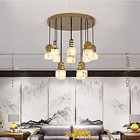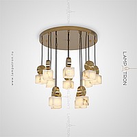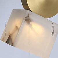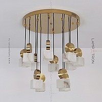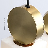 The finished combination of suspended lamps with rectangular marble ceiling on metal disks
