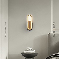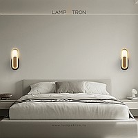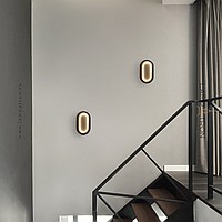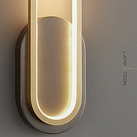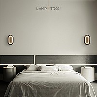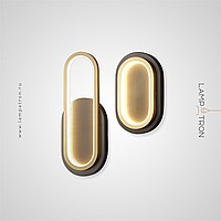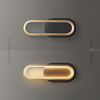 A series of LED wall lamps with an elliptical light element on a brass frame