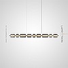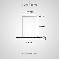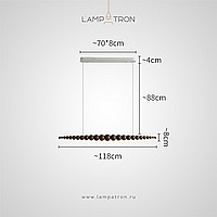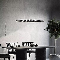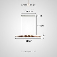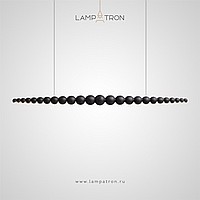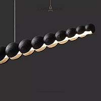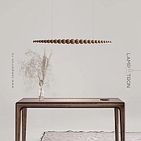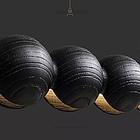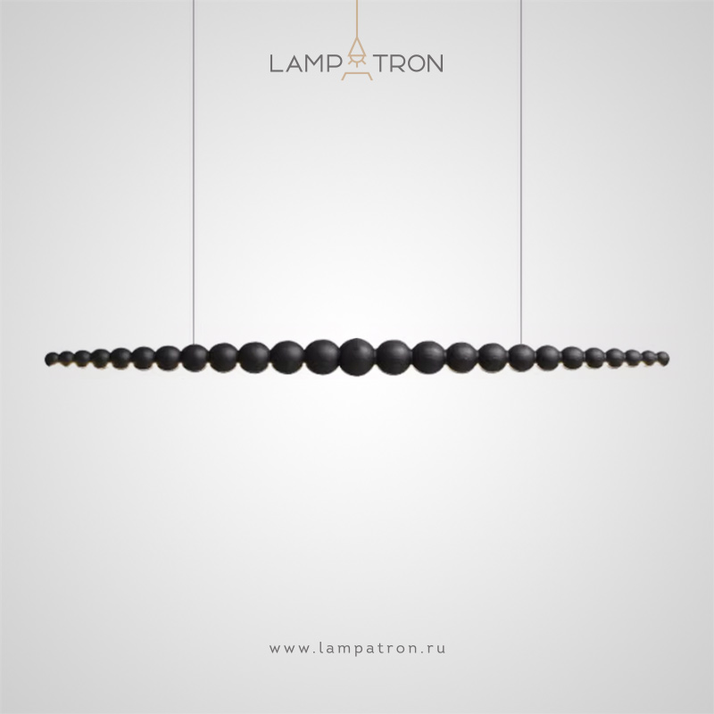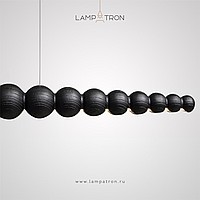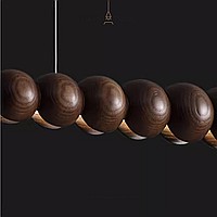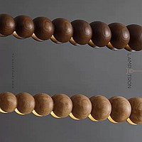 A series of luminaires in the form of a row of balls of different sizes made of solid wood with LED lighting
