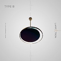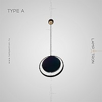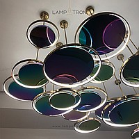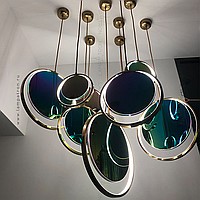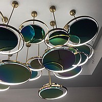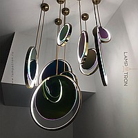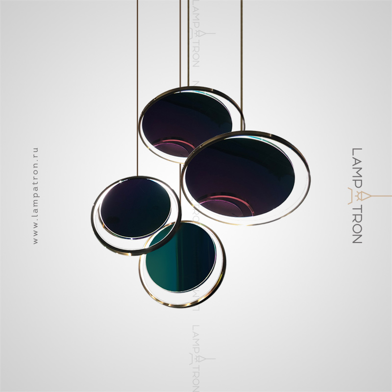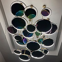 A series of suspended lamps in the form of disks with a glossy reflecting surface with a pearl tint and LED ring