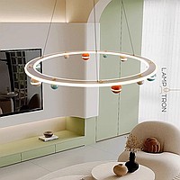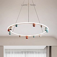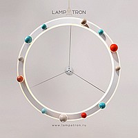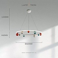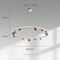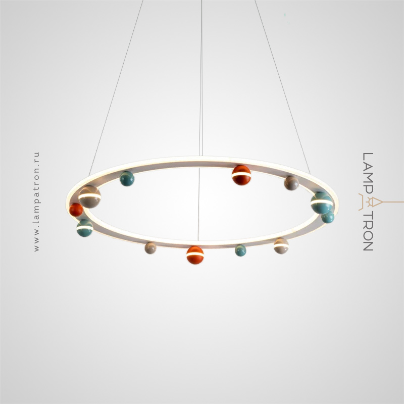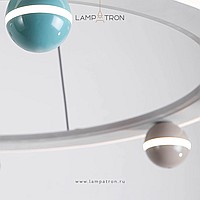 A series of chandeliers with colored décor of balls on a ring frame with LED contour lighting