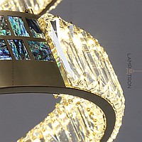 A series of LED chandeliers with multifaceted crystal diffusers and rectangular mother -of -pearl inserts on the ring body