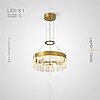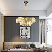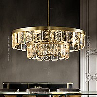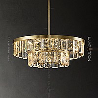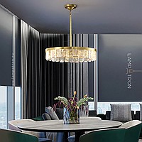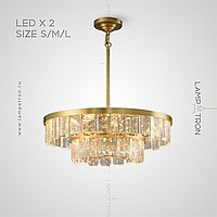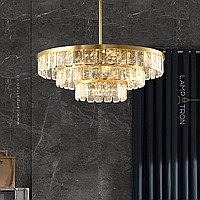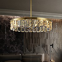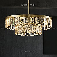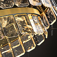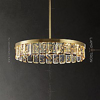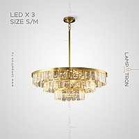 A series of ring LED chandeliers on a vertical rack with multifaceted crystal distortion dialivors