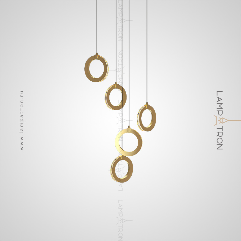 The finished combination of suspended LED lamps with ring -shaped plafants with transparent relief dispersion along the contour of the case