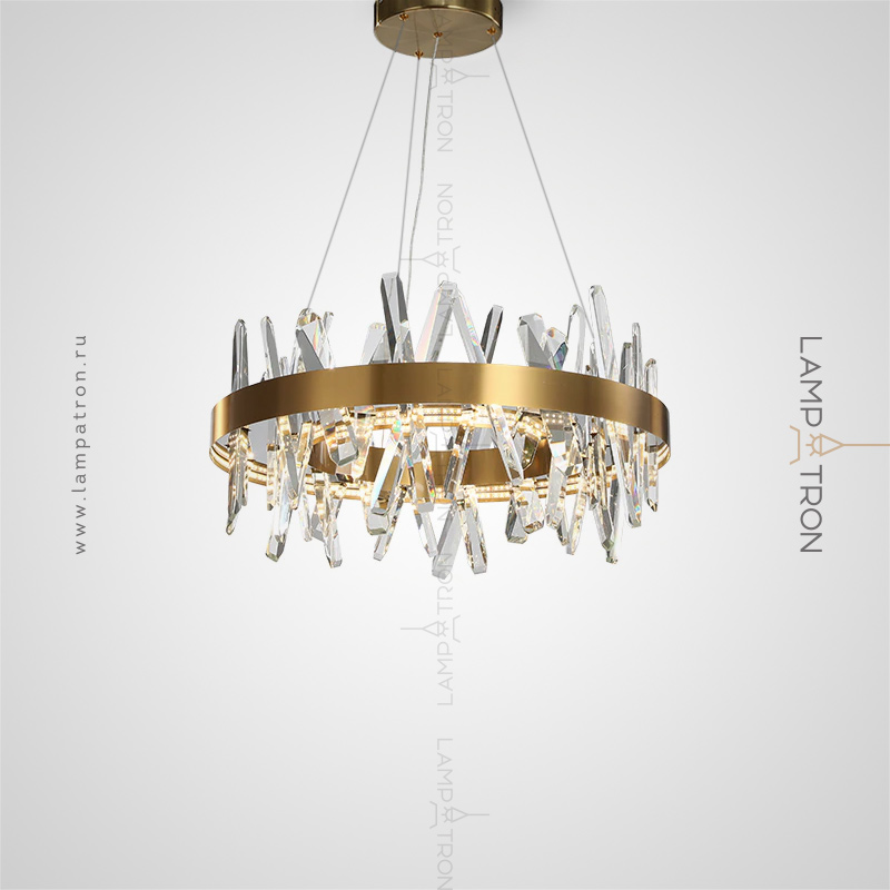 A series of designer chandeliers with LED circuits along the contour and crossed crystal stones on the ring frame