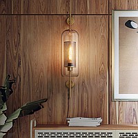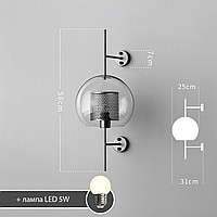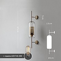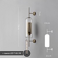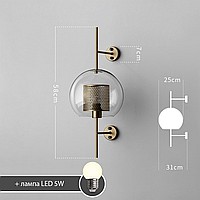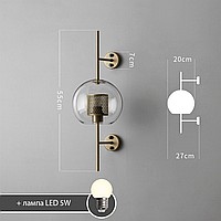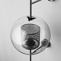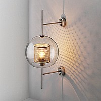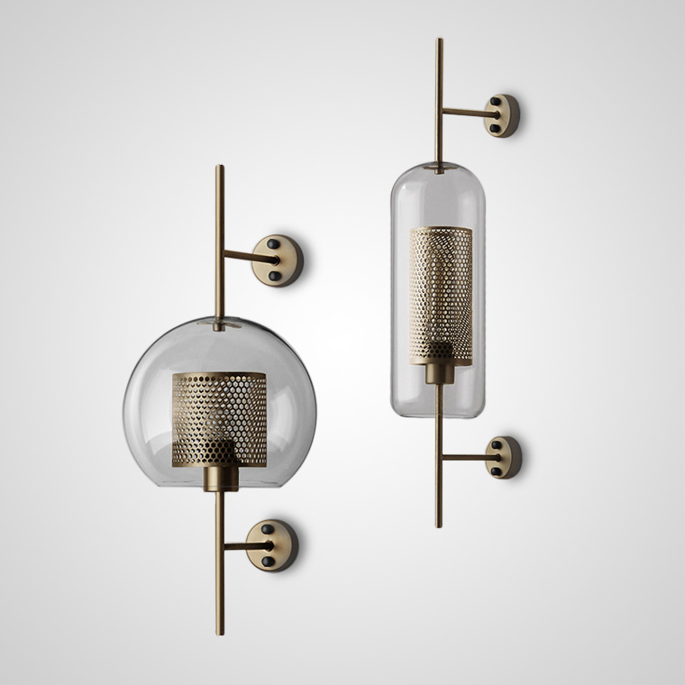 A wall lamp with a combined lampshade of glass and a metal mesh with cells in the shape of honeycombs. 2 types are available: in the form of a truncated ball or cylinder. Each type has two sizes and is characterized by the color of the inner grid (brass or steel).