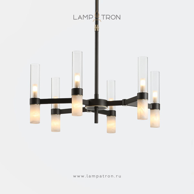 Chandeliers with a combination of diffusers in the form of cylinders made of glass and Spanish marble on a branching frame